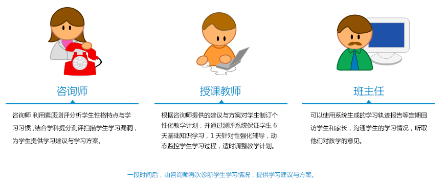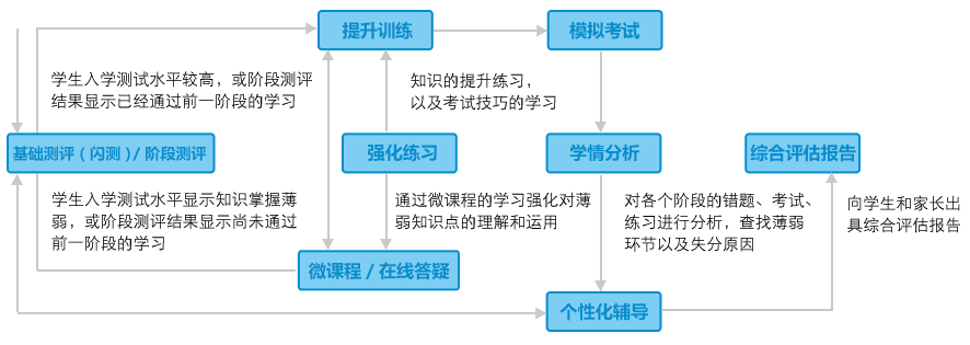 完整的学情“测—评—提”过程,该模式以测评贯穿教学的各个环节,以学生为中心,家长、咨询师、班主任、授课教师共同辅助改善和提高学生学习效果,帮助培训机构通过线上线下相结合、课上课下交互学习的模式精准提高学生学习成绩,提升教学效果。